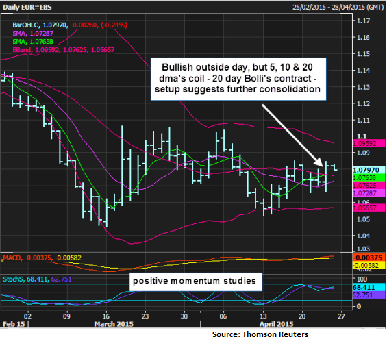Bullish outside day yesterday leaves positive momentum studies Neutral 5, 10 & 20 dma's, 20 day Bolli's contract, consolidation phase Support at 1.0763 and resistance falls at 1.0829 Euro group meeting will be in focus today