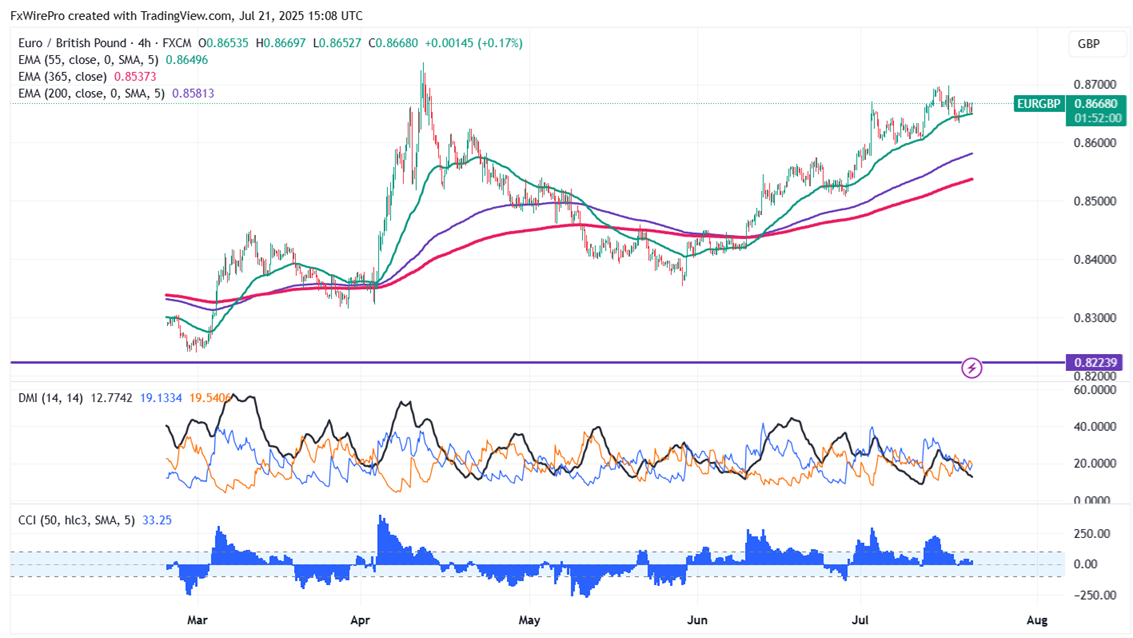 EURGBP trades flat after hitting a multi-month high. Intraday bias remains bullish as long as support 0.8580 holds. It hits an intraday high of 0.86708 and is currently trading around 0.86642.