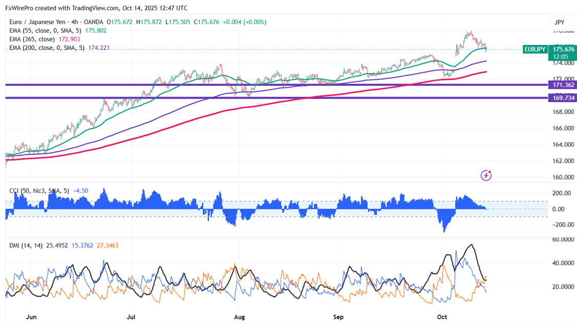 The EUR/JPY pair is trading below 55 EMA, above 200 and 365-H EMA on the 4-hour chart.