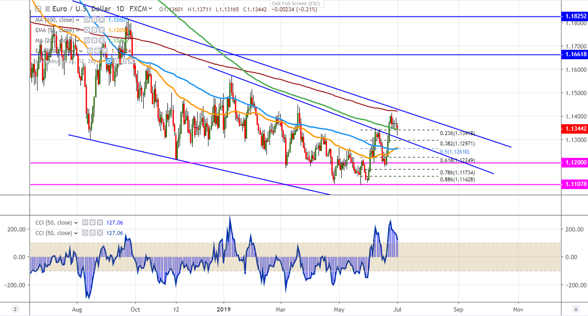 EURUSD has lost nearly 100 pips from high of 1.14122 made on Jun 25th 2019. US-China trade war tension eased after the G20 meeting. Risk sentiment lifted as the US and China have decided to restart trade talks. The pair declined more than 50 pips for the day and is currently trading around 1.13385.