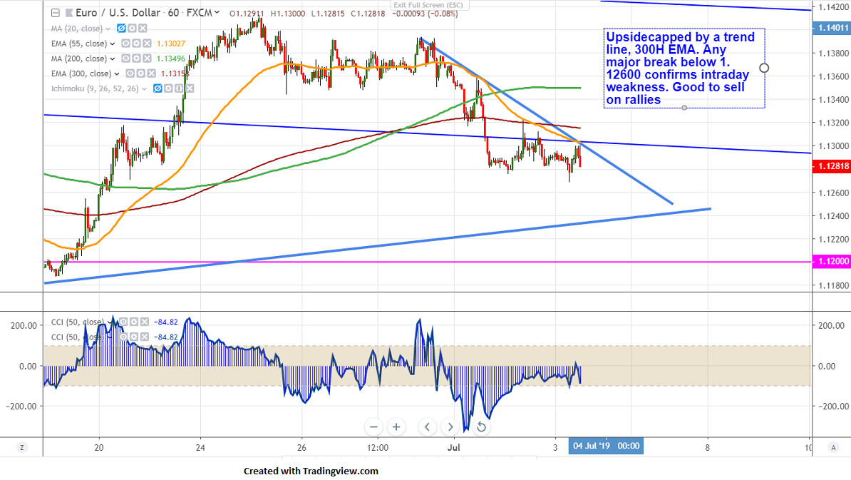 US ADP employment data came slightly weaker than expected. It has added 102000 private jobs compared to forecast of 140K and the previous month got revised lower to 27000 compared to 41000. The slight jump came after the data. But the upside is limited and 1.13160 (300 H EMA)/1.13496 (200 H MA) will be acting as major resistance. Any minor trend reversal only above 1.13600.Bullish continuation only above 1.14500.
