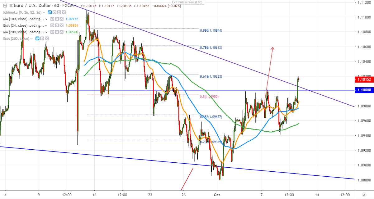 EURUSD has broken major resistance 1.1000 level after a long consolidation. It hits an intraday high of 1.100195 and is currently trading around 1.10142. Markets eye US CPI and ECB minutes for further direction.