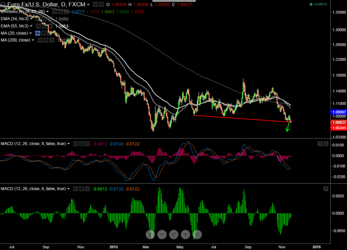 - EUR/USD breaks trend line support 1.0660 (trend line joining 1.08180 and 1.06740) and is currently trading around 1.06580.
