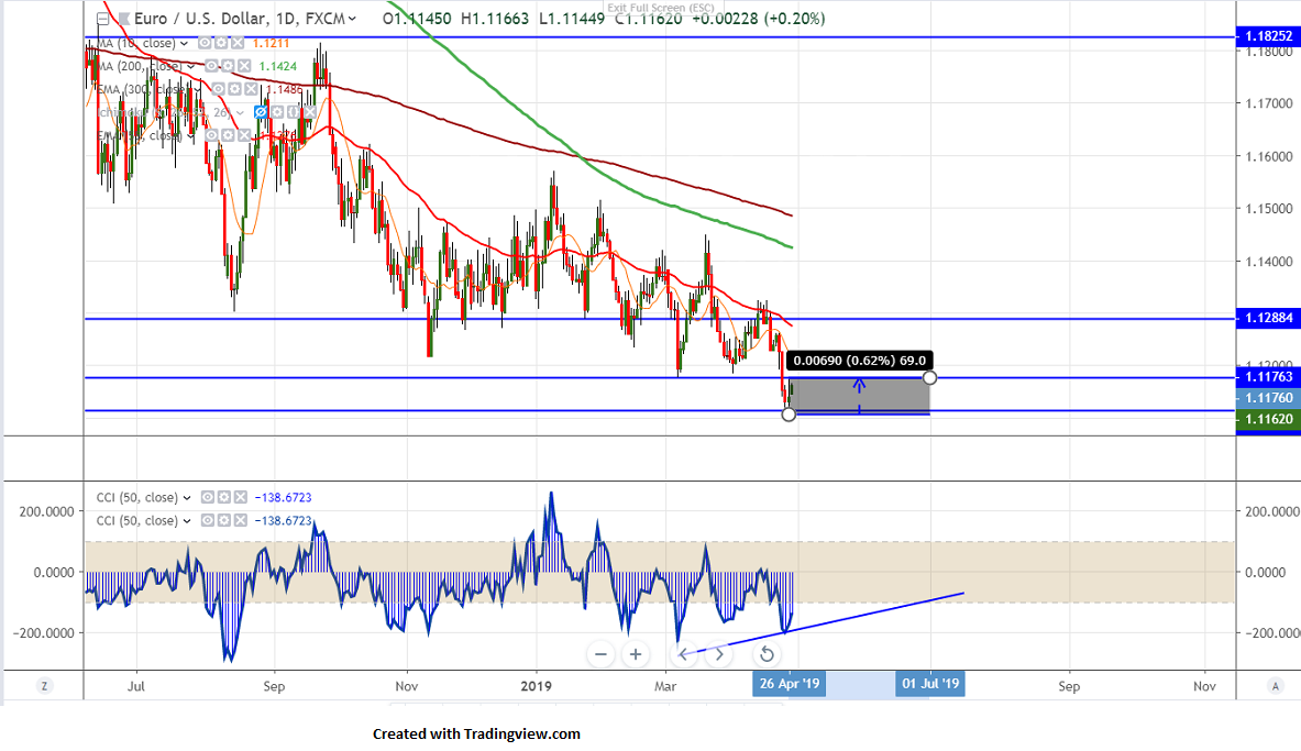 EURUSD has recovered sharply from low of 1.11097 made after release of US GDP data. US GDP came at 3.2% seasonal adjusted annual rate in first three months of 2019 much above forecast of 2.2% and previous quarter it was 2.2%.The pair hits high of 1.11740 and is currently trading around 1.11592.