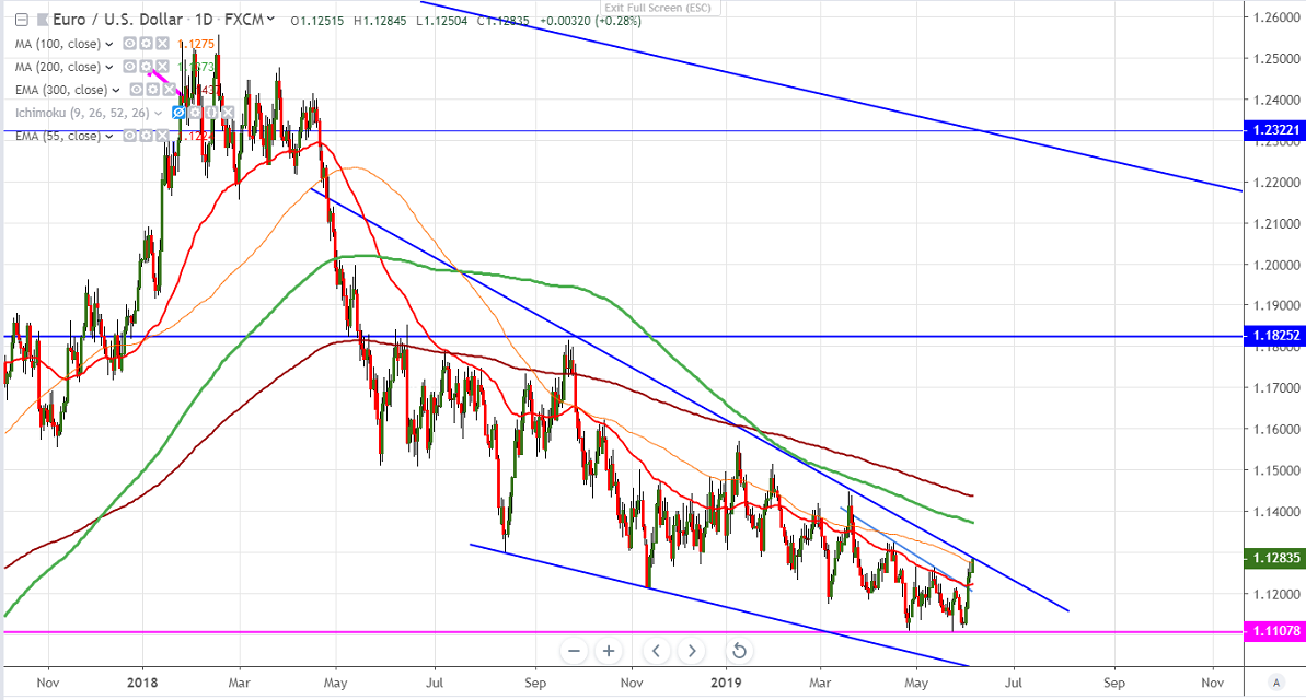 EURUSD trades higher for 3rd consecutive day and jumped more than 130 pips on account of declining US yield. US 10 year yield is trading lower and hits fresh 21-month low at 2.05%. The yield curve inverted which signals recession. The spread between 3 month yield and 10 year yield has widened from 10 basis point to 25 basis point. US ISM manufacturing came at 52.1 less than forecast of 53 lowest level in 31 months. The pair hits high of 1.12620 and is currently trading around 1.12825.