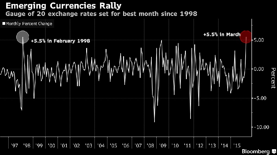 After suffering since 2013 and more so at the start of the year, emerging market currencies had their best month since at least 1998 according to Bloomberg’s calculations. Two days back, Bloomberg dig up an article and the chart shown here that 20 emerging market currencies that it tracks gained about 5.5% in March, which is best in 17 years.