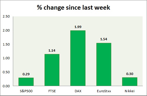 Equities are all green in today's trading. Kindly note all instruments mentioned here are CFDs, whose values might differ from cash or future traded. Performance this week at a glance in chart & table -