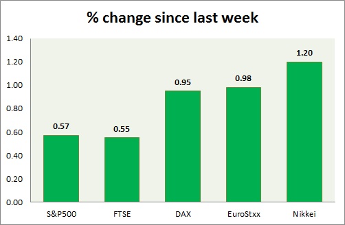 Equities are broadly in green today. Performance this week at a glance in chart & table -