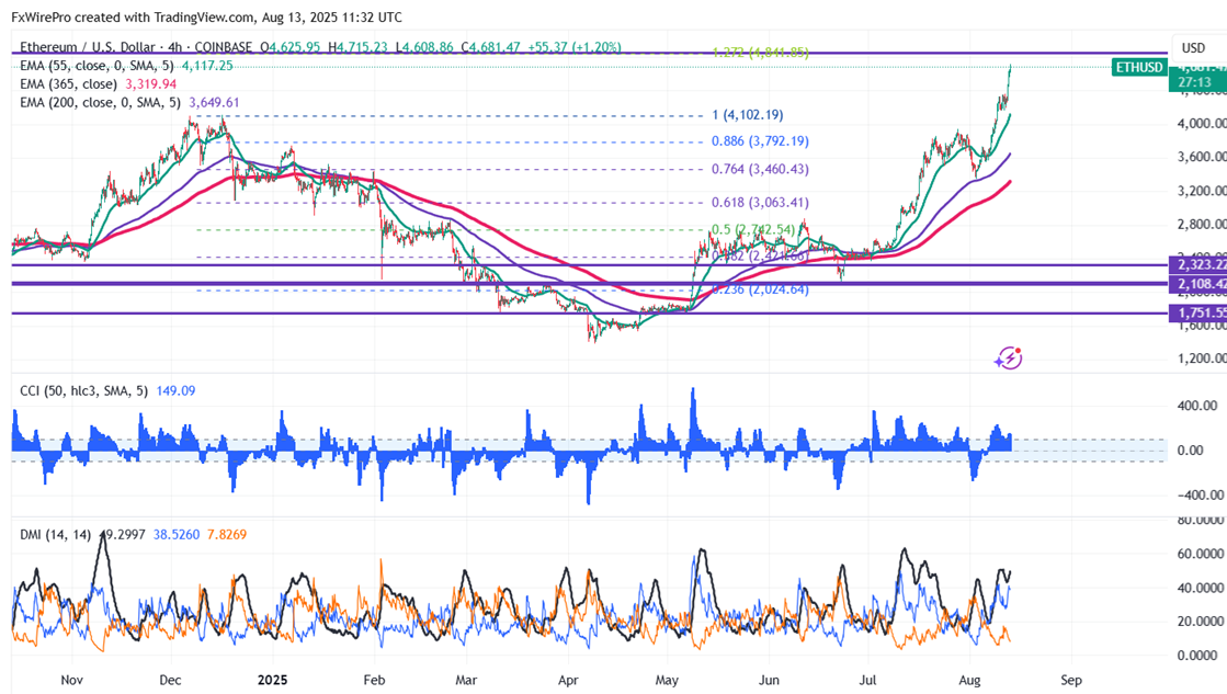 ETHUSD surged sharply on massive ETF inflows. It hits an intraday high of $4715 and is currently trading around $4699. Overall trend remains bullish as long as support $3950 remains intact. Watch out for $4770, any break above targets $5000/$6000. A robust bullish trend will only materialize above $5000.
