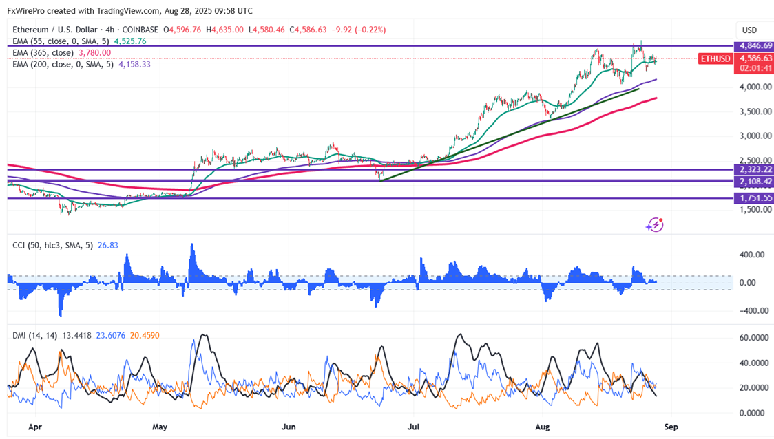 ETHUSD rebounds above $4500 on institutional demand. It hit an intraday high of $4635 and is currently trading around $4588. Overall trend remains bullish as long as support $3500 remains intact. Watch out for $4650, any break above targets $4770/$5000/$6000. A robust bullish trend will only materialize above $5000.