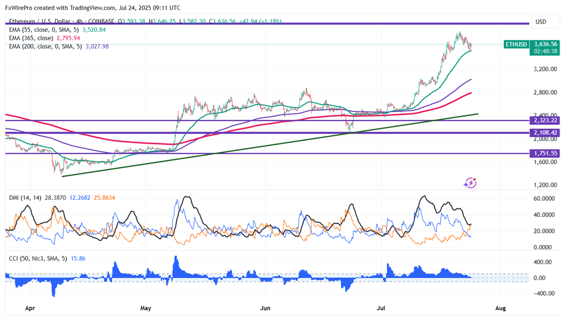 ETHUSD showed a minor bounce after a more than $350 sell-off. It hit a low of $3507.70 yesterday and is currently trading around $3638.74.