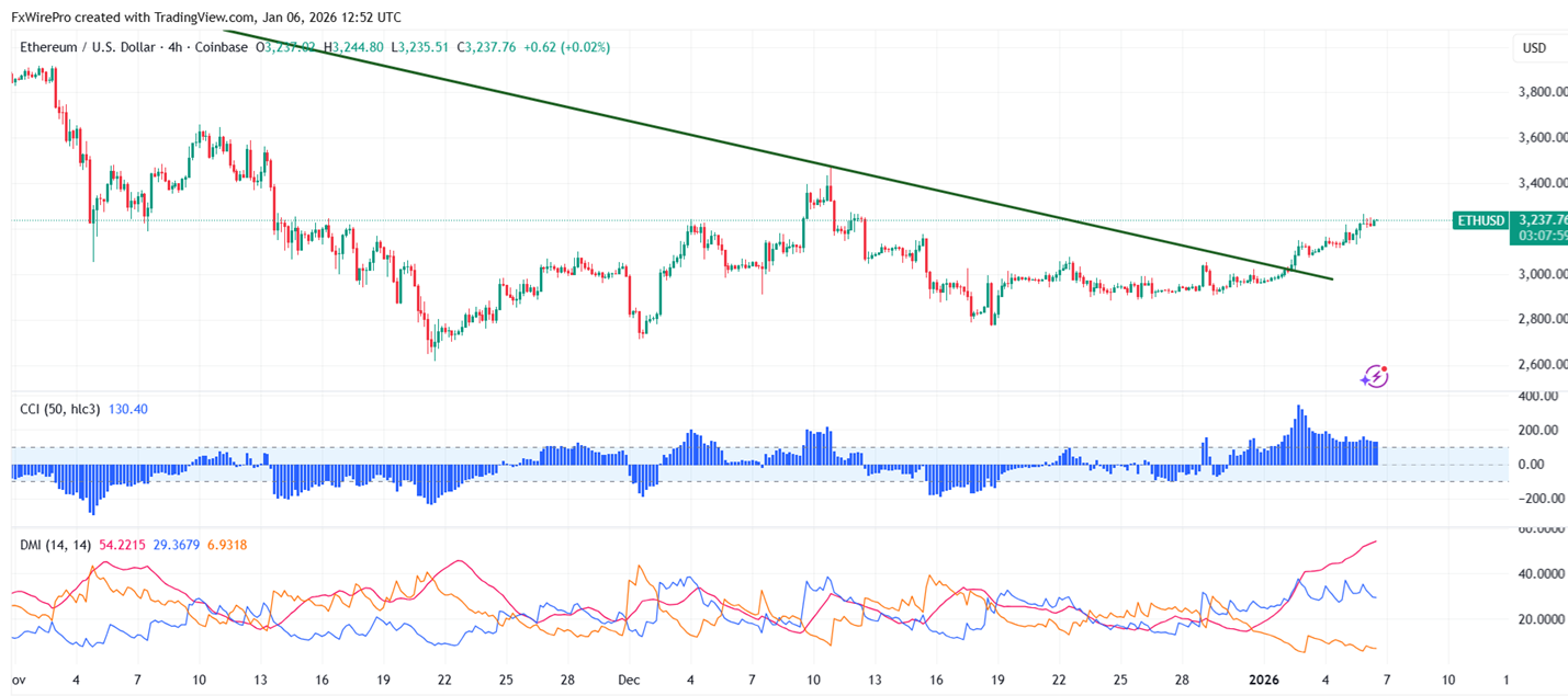 ETHUSD holds above $3200 following the footsteps of Bitcoin. It hits an intraday high of $3264 and is currently trading $3243.