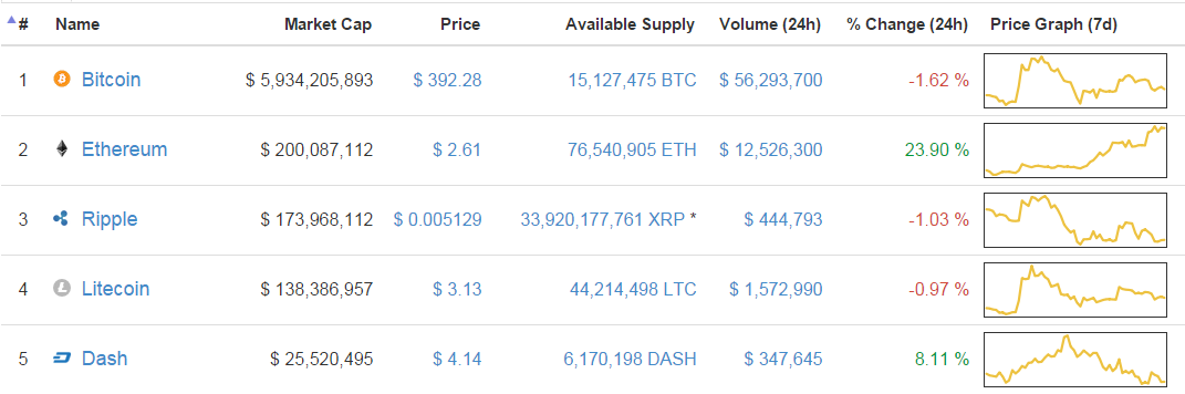 Ethereum’s market cap jumped from third position to second within a day and it has now become the second biggest cryptocurrency, Finance Magnates reported. According to latest data received from Coinmarketcap, Ethereum’s market cap stands at $200,087,112, beating Ripple that is somewhat stagnant at $173 million (at the time of writing).