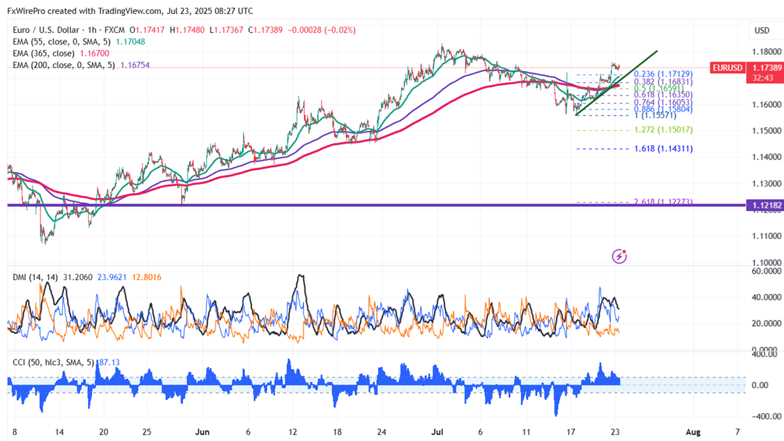 EUR/USD surged above 1.1750 on easing trade tensions. It hit an intraday low of 1.17604 and is currently trading around 1.117428. Overall trend remains bullish as long as support 1.1670 holds.