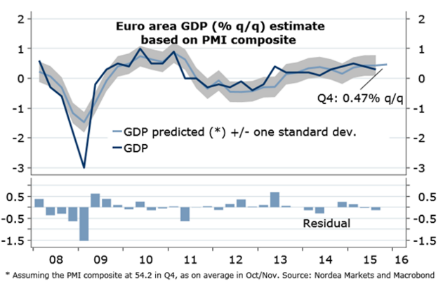 The growth rate of the euro area is expected to post 0.5% in Q4 of this year, estimates Nordea Bank.