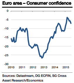Since the beginning of the year, it has improved further on the back of falling oil prices. However, since May, consumer confidence in the euro area has dropped from -3.7 to -7.1 and it is expected to remain unchanged in August on the back of a mixed picture from the real economy, says Societe Generale.