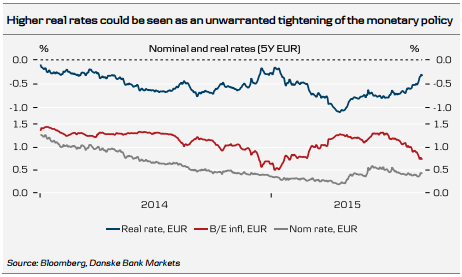 "The ECB is likely to see this as an unwarranted tightening of the monetary policy and this is one of the factors that could lead to further monetary policy easing. However, again, the decline in inflation expectations is likely to be seen in light of the lower oil price, implying the ECB will stick to a dovish stance and not yet signal imminent easing", states Danske Bank in a report to its clint.