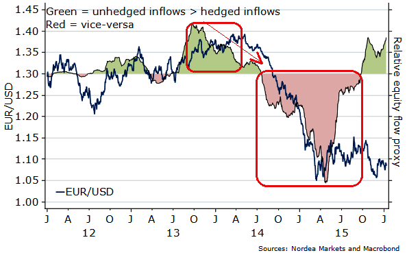 Equity flows into EUR have however recently turned largely unhedged and have thus become positive sentiments for spot EURUSD atleast in the short to medium run in a way they were not over large parts of 2014 and 2015.