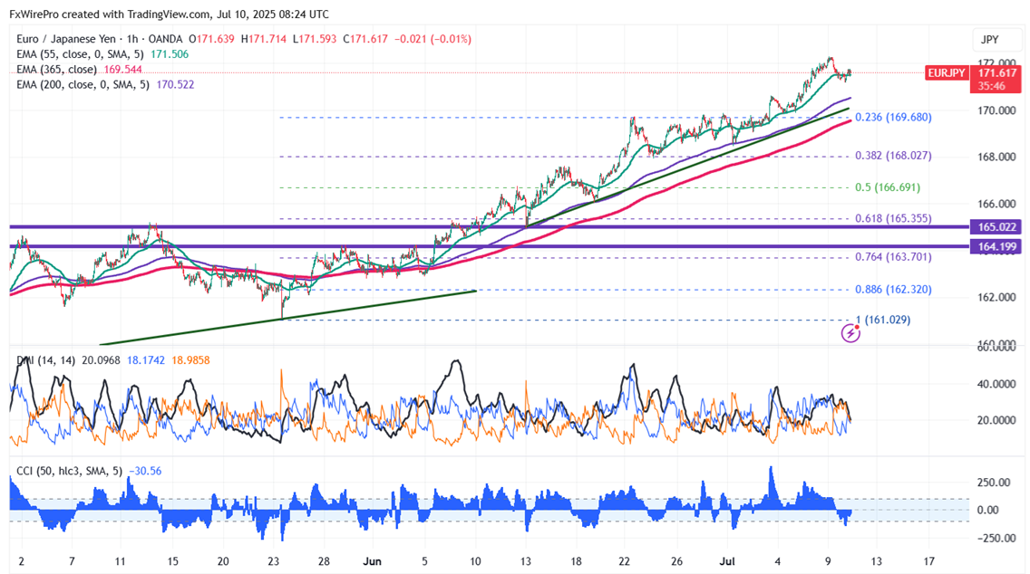 - Immediate Support: At 171, if breached, the pair could fall to 170/169.60/169/168.70/168.45/168/167.60 166.50/ 165.95/165.55/164.50/164.