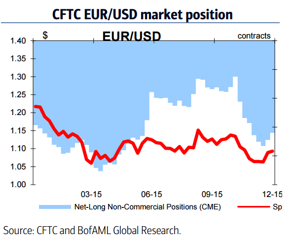 "A level slightly below parity would be consistent with equilibrium estimates that adjust for differences in the business cycle. Selling EUR/USD rallies and taking profits when positioning seems stretched was a strategy that worked during 2015 and we believe will continue working in 2016", adds BoFA Merrill.