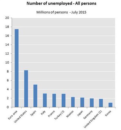 According to latest statistics from OECD (organization of economic cooperation and development) shows Euro area has way more unemployed people among most prominent economies.