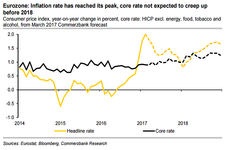 "The rise of the inflation rate to 2.0% in February is likely to further fuel the debate about the ECB soon starting to exit its very expansionary monetary policy. However, the ECB is likely to wait for the rate excluding volatile energy, food, drink and tobacco prices to turn much higher as well," said Commerzbank in a report.