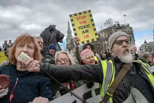 February 2023: Protestors at a ULEZ Protest in Trafalgar Square, London. Loredana Sangiuliano/Shutterstock
