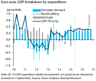 "Domestic demand was the main engine of growth (+0.3pp), although it slowed from Q1, as the boost from lower oil prices is fading and investment failed to gather momentum. Meanwhile, the net trade contribution turned positive again (+0.2pp, the first time since Q2 14), as euro weakness supported stronger exports and import growth remained stable", states Barclays.