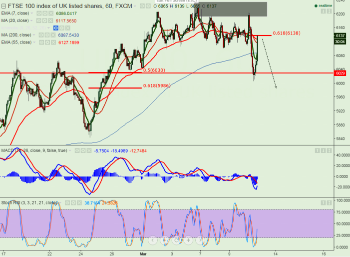 - FTSE100 has made double top around 6219-6204 level and retreated till 6006 yesterday. The index pulled back till 6138 (61.8% retracement of 6219 and 6006) at the time of writing and currently trading around 6132.