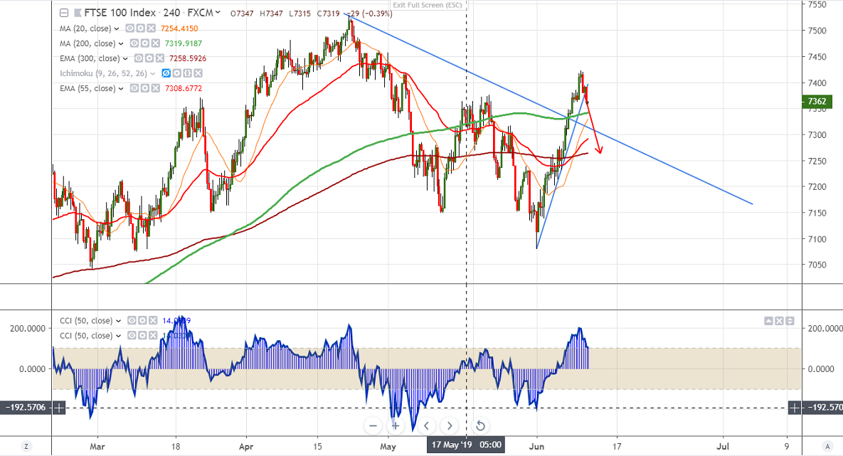 FTSE100 has halted its 1- week of bullish trend and declined nearly 60 points from high of 7422. The entire European market performed well especially Germany DAX after Trump said tariff on Mexico will be stopped indefinitely and car makers performed well. But renewed trade war between US and China is putting pressure on global stock markets. US President Trump said that US will impose tariffs of $300 billion Chinese goods if Chinese President Xi does not attend G20 meeting. The index hits intraday low of 7357 and is currently trading around 7361.