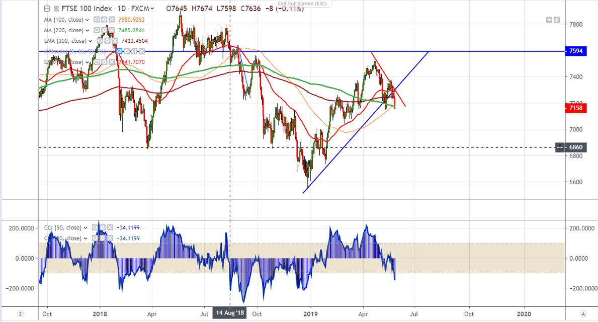 FTSE100 is trading well below 300- day EMA at 7245 and has broken major support 7177 (200-day MA). Now next major level to be watched is 7149 low made on May 13th 2019. Any break below confirms minor trend reversal and a decline till 7075/7040 is possible.