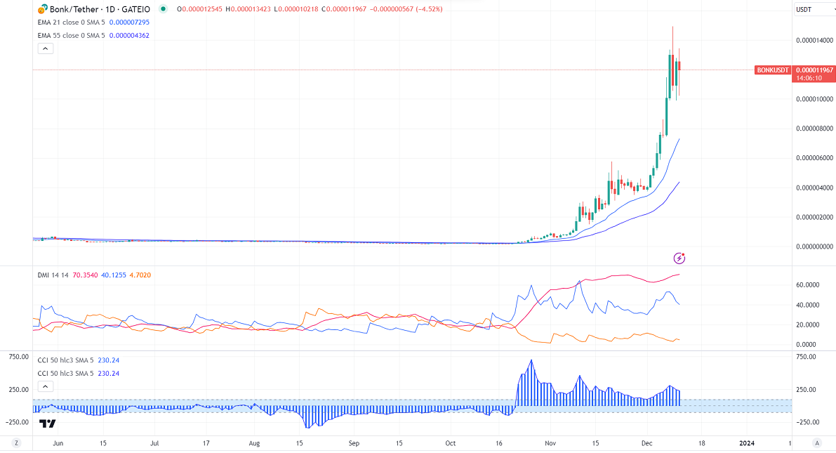 BONK prices hit a new record high of around $0.00001487 after listing on Kucoin. The pair was one of the best performers in Nov month and surged by more than 900%. It currently trading around $0.00001187. The pair is holding well above the short-term (21 and 55-day EMA) and long-term moving average (200-day EMA).