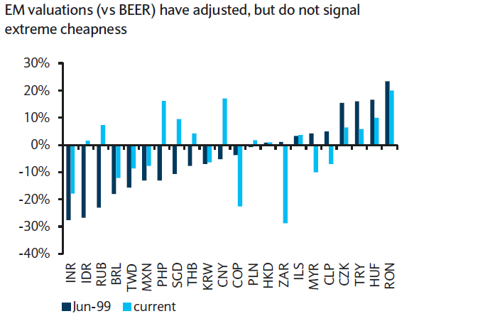 Although some currencies have weakened sharply due to global slowdown especially China, all EM FX do not appear to have overshot. EM Asia FX will face the brunt of slowing Chinese growth and a weaker CNY. Korea and Taiwan are particularly vulnerable given their general openness to trade and their trade exposure to China.