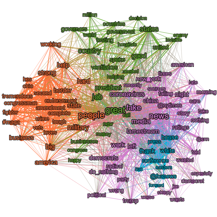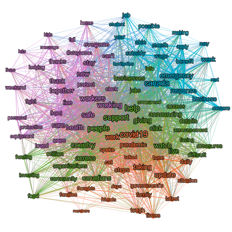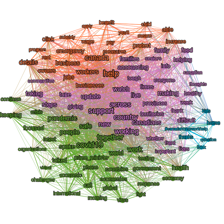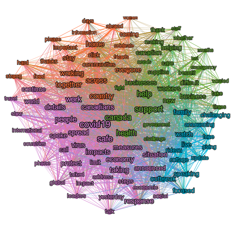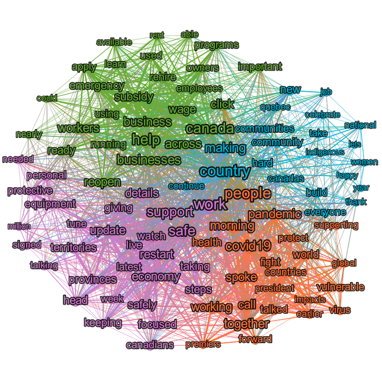 We conducted a quantitative analysis of themes emerging in Trudeau’s and Trump’s tweets during the COVID-19 pandemic. Our study used network science, which considers systems and their interactions. We formed what are called “co-occurrence networks” based on keywords taken from tweets, with two keywords linked if they appear in the same tweet. For example, if the keywords “covid19” and “pandemic” appear in the same tweet, then they were linked. The monthly top 100 keywords from @JustinTrudeau and @realDonaldTrump were extracted based on their frequency.