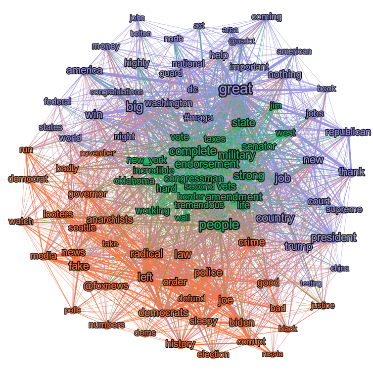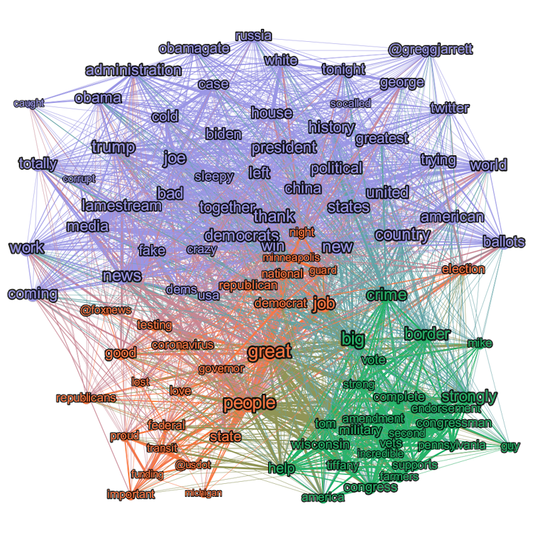 For each month we considered, the keywords fell into a small collection of communities, ranging from three to five. These observations are consistent with an earlier analysis of Trump’s tweets around his election.