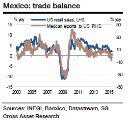 "A stronger manufacturing export growth in H2 2015 and 2016 should help keep the current account balance unchanged, although lower oil prices could also keep it from improving. Falling oil prices have hit both the external account and Mexico's public finances. As a result, the current account balance deteriorated by between 0.5% and 0.8% of GDP on a structural basis, and it would take considerable improvement in manufacturing exports or penetration of new markets to see the current account return to its former size", argues SocGen.