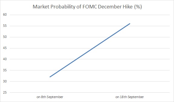 The market is currently pricing 56.9 percent chance that the next hike from the Fed will be in December and that is despite dovish commentaries from several FOMC policymakers. This clearly indicates that the market is becoming concerned over inflation and discounting dovish views from the rate-setting committee.