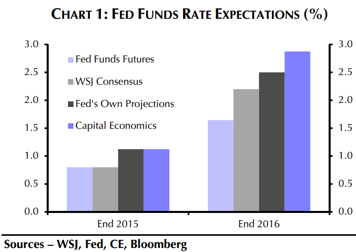 - Even with headline inflation below zero, we then anticipate a first hike in June, with the FOMC pushing the target range for the fed funds rate to 1.00-1.25% by the end of this year and 2.75-3.00% by end-2016, implying mid-points of just over 1% and almost 3% respectively.