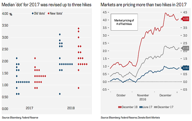 "Fed will hike twice this year (June and December) but risk is skewed towards three hikes. Fed has turned more dovish this year due to shifting voting rights. That said, we believe the Fed is likely to increase the hiking pace in 2018 (late 2017 at the earliest), as we think Trump's fiscal policy is likely to have the biggest growth impact in 2018 due to policy lags," said Danske Bank Markets in a report.