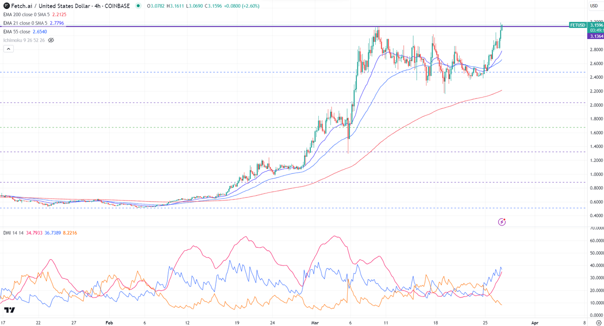 FETCHUSD surged more than 45% in the past one week. It holds above the short-term (21 and 55 EMA) and above the long-term moving average. It hit a high of $3.18 and is currently trading around $3.115.