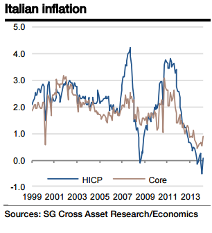 "We expect Italian Italian HICP inflation to average 0.3% in 2015 and 1.3% yoy in 2016. The core component should average 0.9% in 2015 and 1.2% in 2016" said Societe Generale on Tuesday