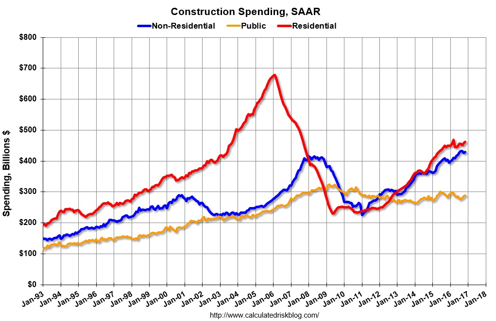 Despite a steady rise in construction spending since 2011, they remain well below the levels seen before the crisis. In 2006, the residential construction spending peaked just below $700 billion (annual rate) and now its stands just around $450 billion. Public construction spending peaked in 2009 above $300 billion but since then it has declined and remains stagnant. The newly elected President of the United States, Donald Trump has promised to ramp up the infrastructure spending and evidence of that would be found in the public construction spending component.