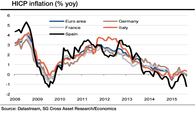 "We maintain that the pace of core inflation is likely to be sluggish and will average 0.8% in 2015 before gradually increasing to 1.2% in 2016", says Societe Generale.