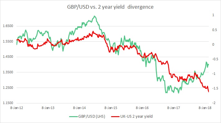 The chart above shows, how the relationship between GBP/USD and 2-year yield divergence has unfolded since 2012.