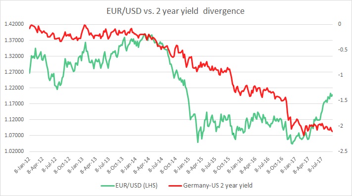 The chart above shows, how the relationship between EUR/USD and 2-year yield divergence has unfolded since 2012. It is evident that these short rates have been a key influencing factor for the pair as policy divergence became evident since 2013.