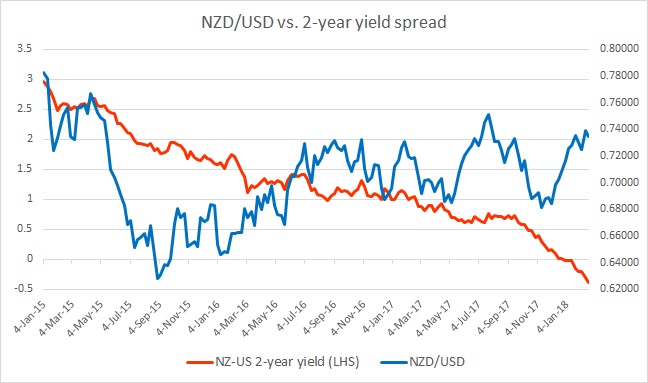 The chart above shows, how the relationship between NZD/USD and 2-year yield divergence has unfolded since 2015.