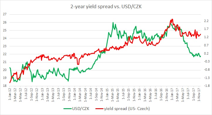 - It can be seen even with a naked eye, that the pair and the yield spread between 2-year treasury and 2-year Czech government bond have enjoyed a fairly close relationship.
