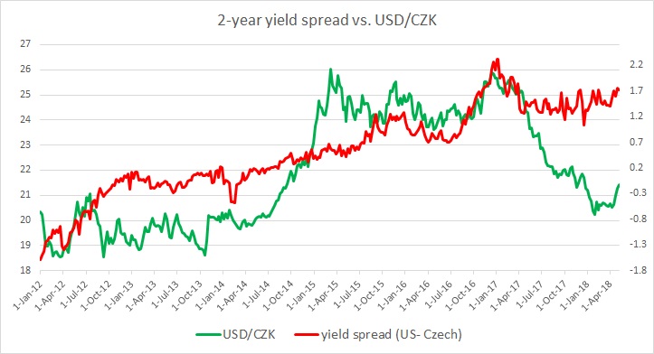 - It can be seen even with a naked eye, that the pair and the yield spread between 2-year treasury and 2-year Czech government bond have enjoyed a fairly close relationship.