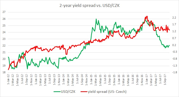 - It can be seen even with a naked eye, that the pair and the yield spread between 2-year treasury and 2-year Czech government bond have enjoyed a fairly close relationship.