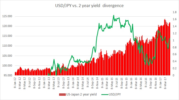 - It had shown excellent response to the yield divergence in the past, especially after Bank of Japan (BoJ) announced its quantitative easing program back in 2012. The close relationship lasted until summer of 2015. US-Japan 2 year yield spread rose from 0.13 percent in 2012 to 0.72 percent by May 2015 and hovered there till October and the exchange rate reached from 76 to 126 in that same period.